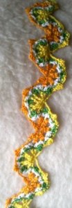 A fehér a kezdősor, aztán a narancssárga fonallal a domborításnál rövid pálcák és láncszemek, összehorgolt virágszirmok a homorú résznél. A fehér kezdősor másik oldalán zöld fonallal a hullámok megerősítése és sárga fonallal pálcika virágok és a domború rész cakkos befejezése.