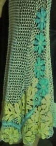 - sor: 12 láncszem, 1 rövidpálcával csatlakozunk a 21 láncszemes ív közepébe, 2 láncszem, 2 egyszerre lekötött hamispálca, 1 rövidpálca ,( ezek adják az apró pöttyöket) 12 láncszem…