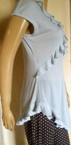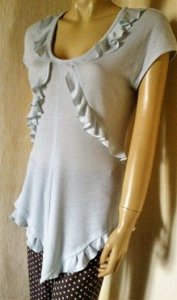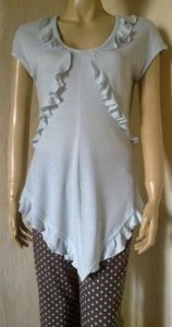 A póló két oldalt volt ívesen hosszabb, ez lett az eleje és háta közép az új pólónak, aljára, mell alá, nyakkivágásra fodrot képzelve spirál csíkokat vágtam a megmaradt részekből, az ujjából………. tökéletes szetté varázsolva.