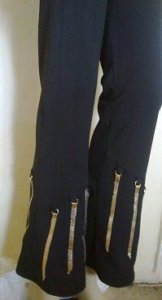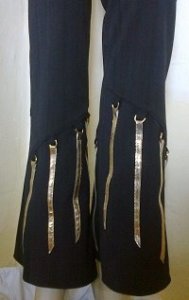Volt egy fekete nadrág, már nagyon ‘feketének tűnt. Rá kincseket’ keresvén megakadt a szemem egy ideje már nem hordott magas szárú fűzős cipőn, rajta az aranyszínű fém bújtatókon, hozzá találtam egy aranyszínű textilbőr övet melyet csíkokra vágtam. A fém karikákat a nadrágról leszedett eldarabolt övtartókra rögzítettem, ebbe fűztem a textilbőr csíkokat rátűzve a nadrág aljára.
